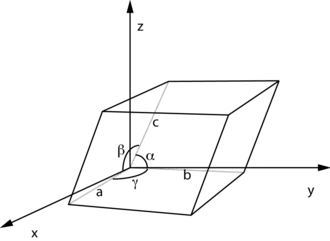Zoals aangegeven in de figuur zijn er drie constanten, , en , waarin de lengten van de ribben van de eenheidscel in worden vastgelegd en drie constanten, , en , waarin de hoeken tussen de kristalassen worden vastgelegd. Hoek ligt tegenover ribbe , hoek tegenover ribbe en hoek tegenover ribbe . De volgorde van de assen is de volgorde van de assen in een rechtshandig assenstelsel.