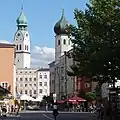 Gezicht op de Sint-Nicolaaskerk (gotisch, 1450) en de H. Geestkerk (1449) te Rosenheim-stad -