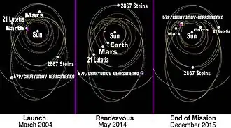 | Fly by | Aarde: 4 maart 2005, 13 november 2007 en 13 november 2009 Mars: 25 februari 2007 Šteins: 5 september 2008 op 800 km Lutetia: 10 juli 2010 op 3000 km | |||