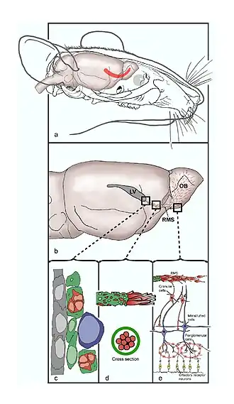 (a) Hoofd van een muis. De locatie van de hersenen en de rostrale migratoire stroom (RMS) waarlangs de nieuw aangemaakte neuroblasten naar de bulbus olfactorius migreren zijn te zien (in rood). (b) De migratie van nieuw aangemaakte neuroblasten begint vanuit de subventriculaire zone bij de zijventrikel, gaat verder langs de rostrale migratoire stroom en eindigt in de bulbus olfactorius waar rijpe interneuronen ontstaan. (c) Schematische weergave van de cytoarchitectuur van de rostrale migratoire stroom langs de ventrikel. Ependymatische cellen (grijs) vormen een monolaag langs de ventrikel met astrocyten (groen), neuroblasten (rood) en transitoire progenitoren (paars). (d) Schematische weergave van de migratie van neuroblasten langs de rostrale migratoire stroom. Astrocyten (groen) omringen de migrerende neuroblasten (rood) en worden verondersteld de neuroblasten te sturen. (e) Migrerende neuroblasten gaan de bulbus olfactorius binnen, migreren straalsgewijs en leiden tot korrelcellen of periglomerulaire cellen.