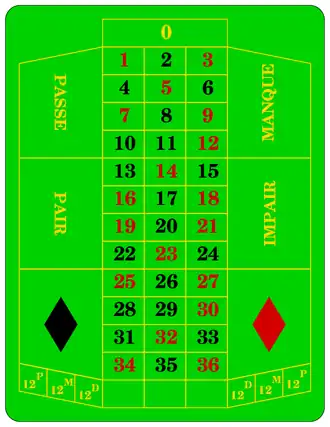 18 | 1 | Frans: Komt de nul uit, dan blijft de halve inzet staan tot de volgende ronde (en prison) valt de 0 nog eens, dan moet de chance simple tweemaal uitkomen, anders is de inzet verloren. Men mag ook de inzet met de bank delen. Amerikaans: Als 0 of 00 valt zijn alle inzetten die niet op het betreffende nummer zijn gezet verloren. |