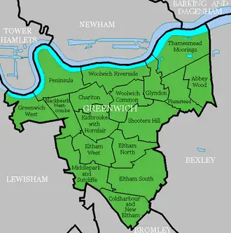 De Royal Borough of Greenwich bestaat uit 17 kiesdistricten (wards), die elk drie raadsleden leveren voor de gemeenteraad, de Greenwich London Borough Council:[6]