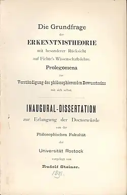 In 1891 promoveerde hij - zonder er ingeschreven te zijn - aan de universiteit van Rostock in de filosofie met een dissertatie met als titel Die Grundfrage der Erkenntnistheorie. Het doctoraat werd niet gehomologeerd door de universiteit, maar werd op 26 oktober 1891 uitgereikt door professor Heinrich von Stein, docent aan de universiteit, met als commentaar 'rite' of 'ausreichend', dus 'voldoende' (Zander 2011: 83). Enkele jaren later verscheen deze dissertatie als boek onder de titel Wahrheit und Wissenschaft, dat hij in 1894 verder uitwerkte in Die Philosophie der Freiheit, dat hij later als grondlegging zou beschouwen voor zijn verder werk in de antroposofie. Het beargumenteerde de mogelijkheid dat mensen spiritueel vrije wezens kunnen zijn door de bewuste denkactiviteit. De poging die hij in dit boek deed om het transcendentaal idealisme, de filosofie van Immanuel Kant, te ontkrachten werd afgewezen door sommige filosofen en geaccepteerd door anderen, en bleef onbekend bij de meesten. Het filosofische werk van Steiner wordt doorgaans niet als belangrijk beschouwd - zijn naam komt haast nooit voor in naslag- of overzichtswerken - en hij wordt meestal niet als filosoof (of wetenschapper) beschouwd, maar veeleer als een esotericus. Heel uitzonderlijk wordt hij wel eens vermeld: een buitenbeentje als de in astrologie en de jungiaanse archetypeleer gespecialiseerde filosoof Richard Tarnas noemt Steiner in zijn boek The Passion of the Western Mind bv. een belangrijk figuur in de hele geschiedenis van het denken. Halverwege 1892 betrok Steiner te Weimar een kamer bij de acht jaar oudere weduwe Anna Eunike (1853-1911), die later diens eerste echtgenote zou worden (Lindenberg 2011:210-211).