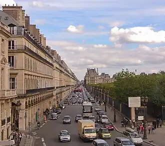 Napoleon liet de straat dwars door het hart van Parijs aanleggen: het eerst aangelegde stuk liep vanaf de Place de la Concorde, toen nog Place Louis XV geheten, langs de Tuilerieën en de noordzijde van het Louvre, dat Napoleon verder liet uitbouwen. Voor het eerst zou er een brede straat langs de noordelijke vleugel van het oude paleis lopen. In het meest westelijke deel van de straat, tussen de Rue de Mondovì en de Rue Saint-Florentin, dat al in 1757-1758 tot stand was gekomen, hadden alle huizen identieke gevels, wat een monumentaal straatbeeld opleverde. De architecten van Napoleon namen dit voorbeeld over. Op Napoleons uitdrukkelijke verzoek werden ook de typerende arcades van de 17e-eeuwse Place des Vosges hier op een aangepaste, 19e-eeuwse wijze toegepast.