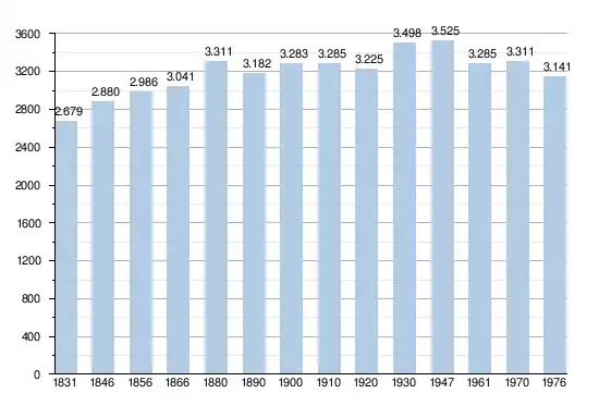 - Bronnen:NIS, Opm:1831 tot en met 1970=volkstellingen; 1976 = inwoneraantal op 31 december
