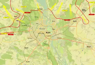 Ten zuiden van Kiev werden op 26 februari 2022 de luchthaven van Vasylkiv en de stad Vasylkiv aangevallen.[82][83] De luchthaven werd geheel verwoest.[84] Het leek een poging om Kiev snel in te nemen, waarbij Spetsnaz de stad infiltreerden ondersteund door luchtlandingsoperaties en een snelle opmars vanuit het noorden.[85] Op 1 maart 2022 werd de televisietoren in Kiev gebombardeerd. Naar alle waarschijnlijkheid wilden de Russen het communicatiemiddel platleggen, wat deels was gelukt.[86] Een drone filmde op 3 maart 2022 de verwoesting in Borodjanka, een stad ten noordwesten van Kiev, waar een flatgebouw was gebombardeerd. In de straten was zwaar gevochten. Enkele honderden meters van het gebouw waren uitgebrande Russische voertuigen te zien.[87] Begin maart 2022 was een verdere Russische opmars langs de westkant van de Dnjepr-rivier beperkt door een sterke Oekraïense verdediging. Op 5 maart 2022 had het, naar verluidt, 60 kilometer lange Russische konvooi nog maar weinig vooruitgang geboekt richting Kiev.[88] De in Londen gevestigde denktank Royal United Services Institute (RUSI) beoordeelde de Russische opmars vanuit het noorden en oosten als 'vastgelopen'.[89]