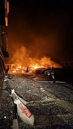 Binnen enkele minuten na deze aankondiging werden explosies gemeld in Kiev, Charkiv, Odessa en de Donbas.[60] In een (vermoedelijk) uitgelekt rapport van de Russische veiligheidsdienst FSB, waarin zij concludeerden dat er 'geen opties waren voor een mogelijke overwinning in Oekraïne', stond dat de dienst niet was ingelicht over het plan om Oekraïne binnen te vallen.[61] Onmiddellijk na de aanval kondigde de Oekraïense president Volodymyr Zelensky de staat van beleg af.[62] Dezelfde avond beval hij een algehele mobilisatie van alle reservisten en Oekraïense mannen tussen de 18 en 60 jaar oud. Zij mochten het land niet meer verlaten, zodat ze beschikbaar bleven voor een oproep.[63][64]