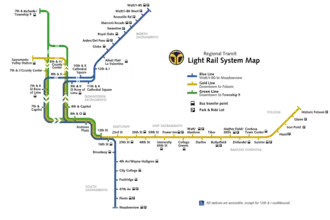 - Blue Line — van de halte Watt/I-80 in North Highlands (noord) naar de halte Meadowview in South Sacramento (zuid)