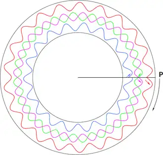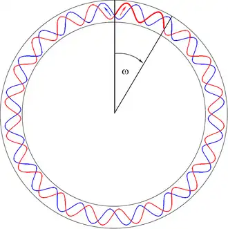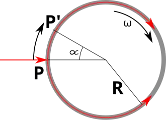 De ring draait met hoeksnelheid ω (omega). We geven grootheden die slaan op de beweging met de klok mee aan met een +, en de andere draairichting met een -. Op het moment dat de lichtstralen weer in P (nu P') aankomen, hebben ze een verschillende hoek afgelegd. De lichtstraal die met de klok meeloopt moet een grotere hoek afleggen dan de lichtstraal die de andere kant oploopt: die legt af. De reistijden van de lichtstralen in beide richtingen zijn respectievelijk en :