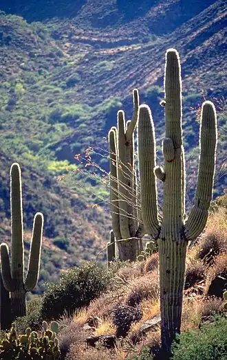 Het stuifmeel van een saguaro wordt overgedragen door vogels, insecten en vleermuizen. De stammen van saguaro's vertonen vaak beschadigingen door blikseminslag, spechten en vraat.