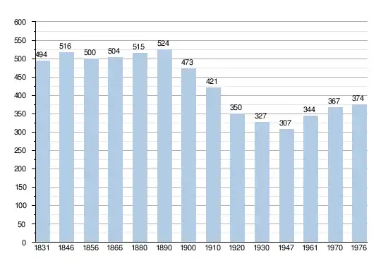 - Bronnen:NIS, Opm:1831 tot en met 1970=volkstellingen, 1976= inwonersaantal op 31 december