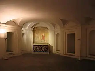 De crypte van het kerkgedeelte geeft een goed beeld van de complexe plattegrond. In de crypte bevindt zich een nis met een altaar. In de nis is in de 18e eeuw een fresco aangebracht van Jezus aan het kruis met de Maagd Maria en Johannes de Doper. In de crypte is ook een nis vrijgelaten voor het graf van Borromini. Omdat hij in 1667 zelfmoord pleegde, is Borromini niet op deze plaats bijgezet.