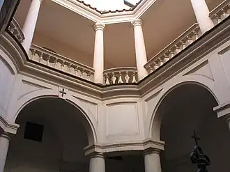 De balustrade boven het kloosterhof kenmerkt de aard van de oplossingen die Borromini toepast in zijn bouwwerken. De spijlen van de balustrade zijn in doorsnede niet cirkelvormig, maar driehoekig met uitgeholde zijden. De spijlen zijn ook niet gelijk, maar wijzen alternerend naar boven en naar onderen. Zo ontstaat een contrast van licht en donker (chiaroscuro of clair-obscur) en valt de balustrade niet weg tegen de witte achtergrond.