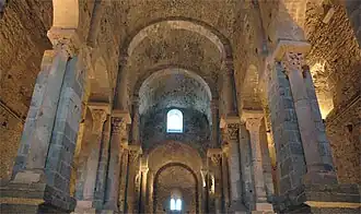 Twee markante torens flankeren de vroegere conversatiezaal (12e – 13e eeuw) van het klooster. De klokkentoren (12e eeuw) heeft uitgesproken Lombardische stijlkenmerken. De tweede toren had een verdedigingsfunctie. Hij werd gebouwd in de 12e of 13e eeuw, dezelfde periode waarin het complex werd uitgebreid met een nieuw en groter kloostergebouw boven op de restanten van het oorspronkelijke klooster.