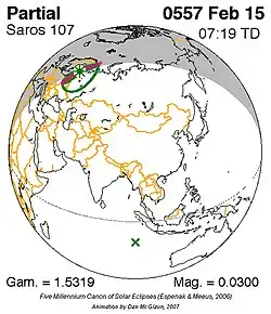 Saros 107 is een reeks zonsverduisteringen in de periode 15 februari 557 t/m 5 april 1837 . Deze serie duurde 1280 jaar en 50 dagen, bevatte 72 verduisteringen en viel samen met de Inexserienrs 19 t/m 90.