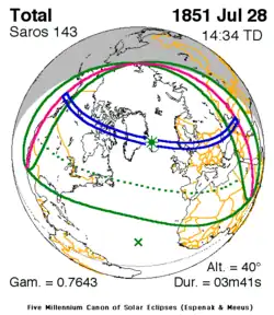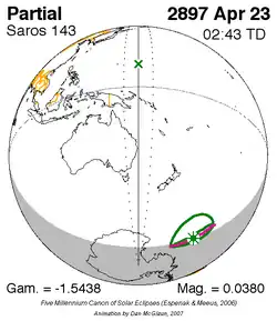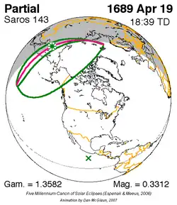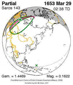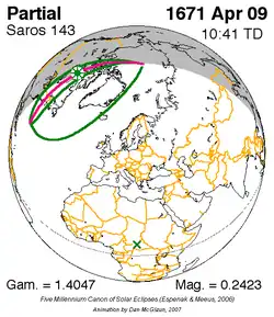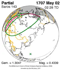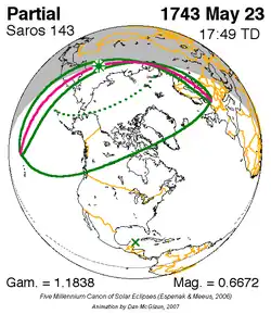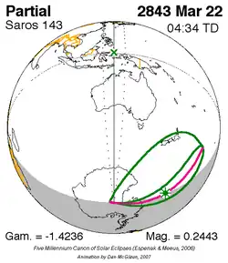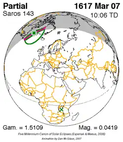 Saros 143 is een reeks zonsverduisteringen in de periode 7 maart 1617 t/m 23 april 2897 . Deze serie duurt 1280 jaar en 47 dagen, bevat 72 verduisteringen en valt samen met de Inexserienrs 20 t/m 91.