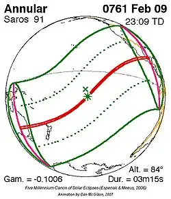 | Langste ringvormige zonsverduistering | 19 Juni 977 | 5m 16s | - |