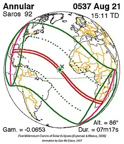 | 35 | 42 | 21 aug. 537 | 15:10:41 | A | 0.9384 | 8 N | 27 W | 86 | 229 | 7m 17s |