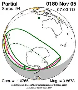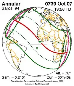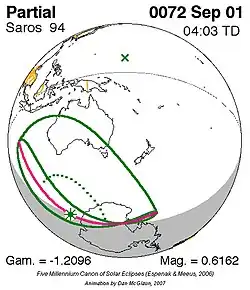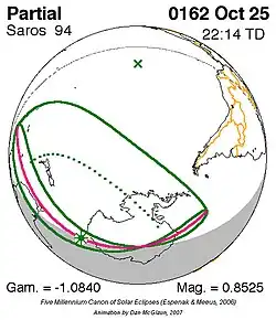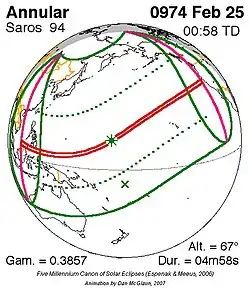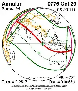 | Kortste ringvormige zonsverduistering | 26 September 721 | 0m 7s | - |