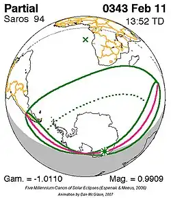 | Grootste gedeeltelijke zonsverduistering | 11 Februari 343 | - | 0.99063 |