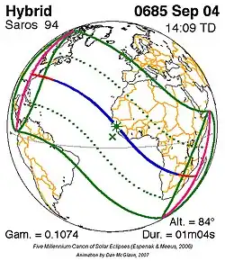 | Langste hybride zonsverduistering | 4 September 685 | 1m 4s | - |