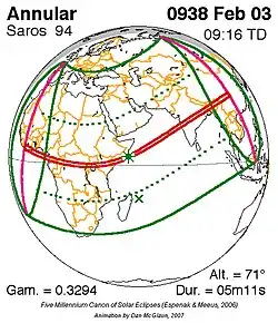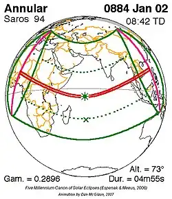 | Langste ringvormige zonsverduistering | 24 Januari 920 | 5m 12s | - |