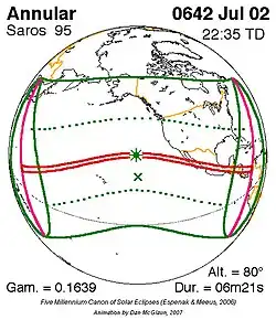 | 34 | 43 | 2 juli 642 | 22:34:58 | A | 0.9477 | 33 N | 141 W | 80 | 195 | 6m 21s |