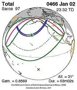 | 20 | 30 | 2 jan. 466 | 23:31:44 | T | 1.0357 | 35 N | 158 W | 31 | 233 | 3m 2s |