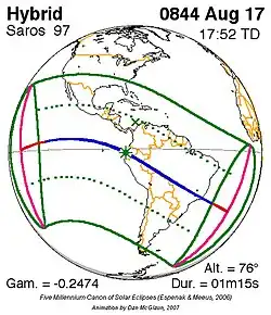 | Langste hybride zonsverduistering | 17 Augustus 844 | 1m 15s | - |