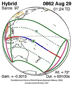 | Kortste hybride zonsverduistering | 29 Augustus 862 | 0m 33s | - |