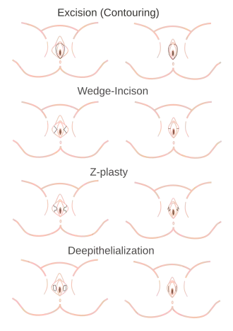 - Via laterale excisie. Hierbij wordt slijmvlies over de hele lengte van de schaamlip weggesneden. Dit wordt gedaan bij veel overtollig weefsel of wanneer sprake is van hyperpigmentatie.[2] Dit is relatief de eenvoudigste ingreep, maar geeft vaak een wat kunstmatig resultaat, doordat het natuurlijke aspect van de randen van de schaamlippen verloren gaat.