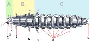 Het achterlijf bestaat altijd uit tien segmenten, waarvan de achterste twee samengegaan zijn zodat het zichtbare aantal segmenten kleiner is. Aan de bovenzijde draagt ieder segment een beschermende, chitineuze plaat, de tergiet. Aan de onderzijde zit een vergelijkbare plaat, de sterniet.