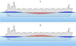 Als een schip in het midden zwaarder is dan aan de uiteinden, zoals bij een geladen tanker, dan zal deze doorbuigen, wat sagging wordt genoemd. Hierbij is de bodem het belangrijkste sterktedeel. Als het middendeel lichter is dan de uiteinden, zoals bij een tanker in ballast, dan zal deze opbuigen. Dit wordt een kattenrug of hogging genoemd. Hierbij is het dek het belangrijkste sterktedeel.