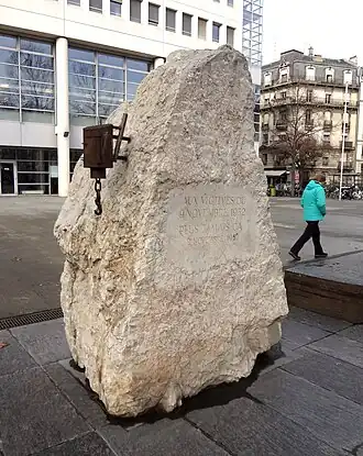 - ↑ (fr) La pierre de Plainpalais a été déplacée[dode link], GHI, 7 november 2018.