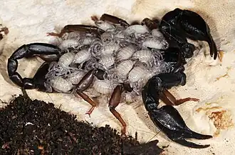 Nadat een schorpioen is geboren wordt direct de bovenzijde van het moederdier opgezocht. Het is niet zozeer de aanwezigheid van de moeder die hierbij een rol speelt, maar meer het bij elkaar kruipen van de jongen. Schorpioenen leven vaak in droge omgevingen en het zachte pantser van de pasgeborenen is nog niet waterdicht waardoor ze vocht verliezen. Door op een vaste plaats bij elkaar te blijven wordt het vochtverlies sterk beperkt. Het moederdier verdedigt haar jongen fel en als ze haar kroost kwijtraakt gaat ze direct naar haar jongen op zoek. Het vrouwtje houdt haar scharen tegen de grond om haar jongen sneller op haar rug te laten klimmen, de bioloog Jean-Henri Fabre beschreef dat een vrouwtje die haar kroost kwijt is net zo makkelijk de juvenielen van een ander vrouwtje op zich neemt. Soms wordt echter een jong opgegeten als het van de rug afvalt.[4]