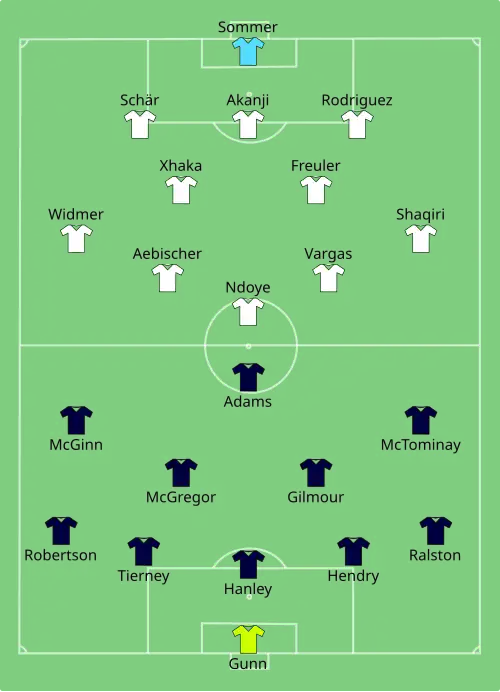 Schotland speelde op 24 juni 2024 zijn tweede wedstrijd, tegen Zwitserland in Keulen. In de dertiende minuut schoot Scott McTominay de Schotten op een voorsprong met een schot dat door Fabian Schär van richting werd veranderd. In de 26ste minuut leverde Anthony Ralston de bal in bij Xherdan Shaqiri, die namens de Zwitsers vanaf buiten het strafschopgebied de bal in de kruising schoot. Na een half uur werd een schot van Dan Ndoye gestopt door Angus Gunn. In de tweede helft schoot Ndoye naast en kopte Grant Hanley op de paal, maar bleef de score bij 1–1.[7] Tijdens de wedstrijd raakte Kieran Tierney geblesseerd aan zijn hamstring, waardoor hij de rest van het toernooi niet meer in actie kon komen.[8]