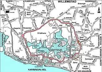 Het Schottegat ligt tegenwoordig geheel in Willemstad. Aan het Schottegat liggen onder meer: