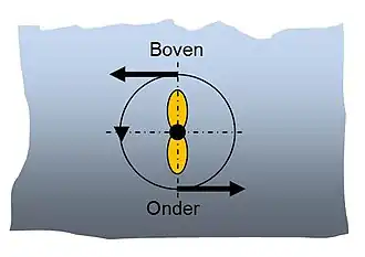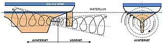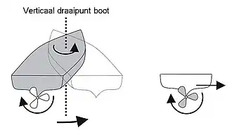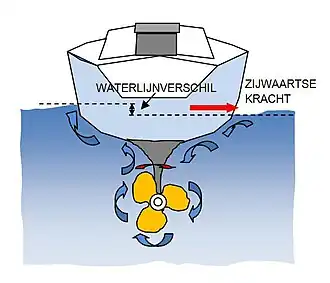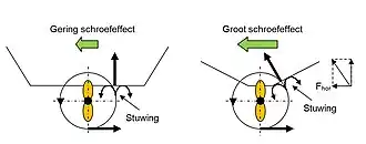 - Door het opzij drukken van het achterschip gaat de kop van het schip de andere kant op; het schip draait om een verticale as. De mate waarin dit gebeurt hangt af van de rompvorm en vooral van de kiel.