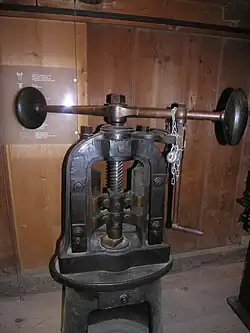 Een schroefpers (Engels: screw press, Frans: balancier) is een machinepers bestaand uit een stevige, vaak hoefijzervormige houder met een gat met schroefdraad bovenaan en een T-vormig stuk met schroefdraad wat in het gat van de houder geplaatst is. De horizontale uiteinden van de T zijn verzwaard met gewichten, waaraan touwen zijn bevestigd. De schroefpers werd gewoonlijk bediend door drie man. Twee slingerden de schroef ritmisch heen en weer met behulp van de touwen en de versnelling van de gewichten, waardoor de stempels op het muntplaatje werden geperst. De derde (vaak een jongen) plaatste de rondellen en verwijderde de geslagen munten (niet zelden ten koste van zijn vingers in een moment van onoplettendheid).