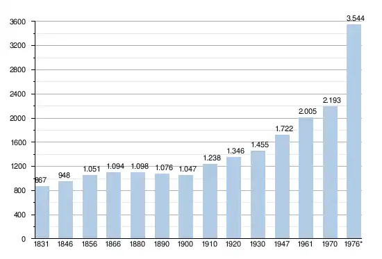 - Bronnen:NIS, Opm:1831 tot en met 1970=volkstellingen; 1976 = inwoneraantal op 31 december
