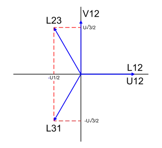 De secundaire zijde van de transformatoren zijn direct aangesloten op het tweefasennet, waarbij UV12 een faseverschil van 90° heeft ten opzichte van UU12.