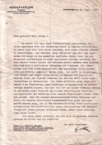 - Yours Faithfully, Adolf Hitler Correspondence between Delmer and Hitler in 1931.