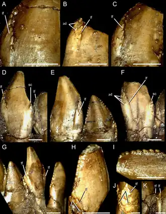In 2016 vond een studie naar de onderkaak een groot aantal unieke kenmerken, autapomorfieën. Het voorste tandeloze deel van het dentarium is lang, met ongeveer een vijfde van de lengte van de tandenrij. De voorste onderkaak is sterk naar beneden gebogen, onder een hoek van dertig graden. Een lijn getrokken tussen het voorste en achterste punt van de gewelfde tandenrij, nadert de onderrand van de kaak sterk en ligt op het dichtstbijzijnde punt op minder dan de helft van de verticale hoogte van de kaak. De geringste hoogte van de kaak bevindt zich achter de tandenrij, alwaar het dentarium een insnoering toont tussen de tandenrij en het contact met het surangulare. Het beenplateau buiten de tandenrij ligt op halve hoogte tussen de bovenrand en de onderrand van de kaak. De tandenrij reikt niet tot aan het surangulare en een kwart van de achterste bovenrand van het dentarium is tandeloos. De tandkassen van de onderkaak hebben een gekartelde binnenrand. Er bindt zich een knik op het raakvlak van het dentarium en het surangulare die een hoek van honderdzestig graden met elkaar maken. In het spleniale ligt het onderste foramen vóór het niveau van het bovenste foramen. De achterrand van het spleniale heeft een inkeping met een hoek van negentig graden als contact met het prearticulare. Er bevindt zich geen zijplateau op het surangulare als verbinding tussen de bovenrand van het zijvenster en het articulare. De zijrichel op het surangulare is verticaal laag. De onderrand van het angulare is plat. Het prearticulare ligt laag en de achterrand ervan loopt van binnen bezien over in de onderrand van de onderkaak. Het hoofdlichaam van het prearticulare is recht. Het prearticulare heeft een verbrede voorste tak met een rond profiel. De voorste snijrand van de dentaire tanden is naar achteren gevouwen en heeft vertandingen. De voorste helft van de dentaire tandkroon toont tandjes buiten de snijrand. De onderkant van de voorste snijrand draagt een driehoekig facet nabij de tandhals. De drie achterste tanden, de 22e, 23e en 24e, zij kegelvormig en hebben een extra snijrand aan de binnenzijde zodat ze drie carinae dragen.