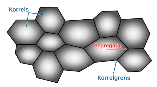 - Korrelgrens-segregatie: tussen twee gevormde korrels met een concentratieverschil. Dit kan ook zijn tussen een onzuivere precipitaat en een aangrenzend korrel. De impuriteiten en roosterdefecten stapelen zich op bij de korrelgrens tijdens het stollen, waardoor een concentratieverschil ontstaat, de "segregatie".