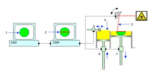Een virtueel CAD-model (1) wordt in lagen (2) opgedeeld. Deze lagen worden een met een laser (3), gestuurd met een prisma, een voor een gesinterd tot er een volledige kopie van het virtuele model is verkregen.