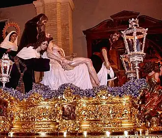 - Hermandad "Sagrada Mortaja" Koninklijke broederschap van de Heilige Lijkwade. Antigua, Real e Ilustre Hermandad de Nazarenos de Nuestro Padre Jesús Descendido de la Cruz en el Misterio de su Sagrada Mortaja y María Santísima de la Piedad. Deze broederschap heeft slechts 1 paso, die dateert uit de 17de eeuw.