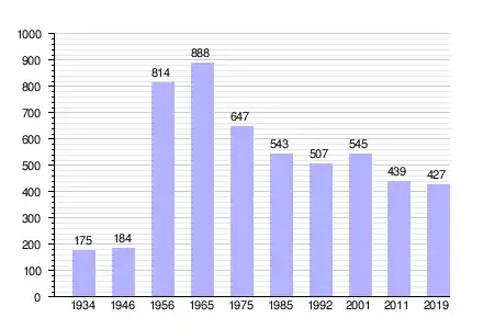 Op 31 december 2019 telde het dorp 427 inwoners, een daling vergeleken met het maximum 888 personen in 1965.[2]
