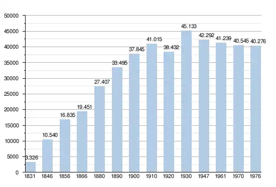 - Bronnen:NIS, Opm:1831 tot en met 1981=volkstellingen; 1990 en later= inwonertal op 1 januari