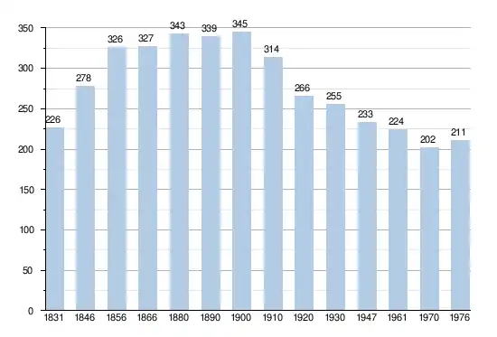 - Bronnen:NIS, Opm:1831 tot en met 1970=volkstellingen, 1976= inwoneraantal op 31 december