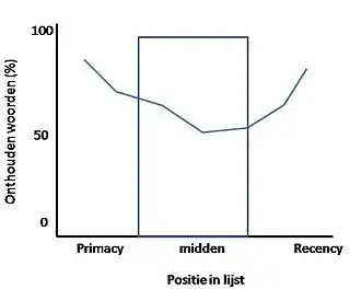 - Daarentegen blijkt het recentheidseffect heel gevoelig te zijn voor een afleidende taak (bijvoorbeeld een rekenopdracht) die de proefpersoon nadat de lijst is aangeboden moet uitvoeren. Nadat de rekenopdracht is uitgevoerd, blijkt het recentheidseffect sterk te zijn afgenomen.[4] Dit komt doordat de items in het buffer van het kortetermijngeheugen aan snelle vervaging (decay) onderhevig zijn. Dus als de reproductie wordt uitgesteld, zijn deze items alweer vergeten.